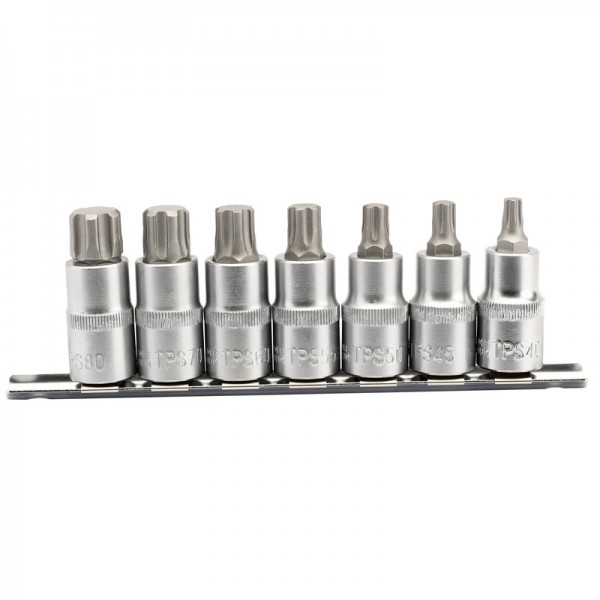 Expert Quality, 7 Draper TX - STAR® Plus socket bits, 55mm long. All socket manufactured from hardened and tempered chrome vanadium steel with sand blasted bits of S2 silicon steel. Each socket has a knurled ring for extra grip. Supplied on a steel socket retaining rail.