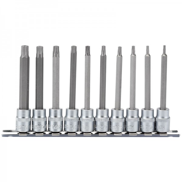 Expert Quality, 10 Draper TX - STAR® security socket bits, 100mm long. All socket manufactured from hardened and tempered chrome vanadium steel with sand blasted bits of S2 silicon steel. Each socket has a knurled ring for extra grip. Supplied on a steel socket retaining rail.