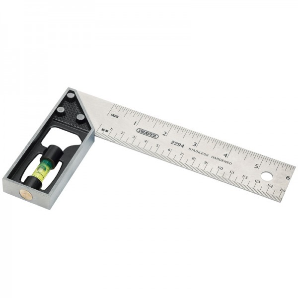 Matt black metal stock with machined faces and spirit level. Polished steel blade is graduated mm and 1/16” on both sides. Display packed.