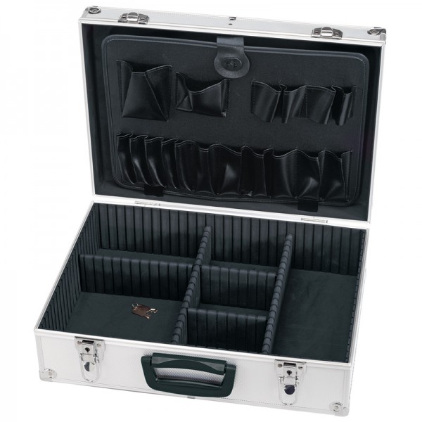Aluminium-effect tool case, complete with pallet in lid and padded dividers. Heavy duty square corners, twin lockable catches and Supplied with two keys. Ideal tool case for engineers, photographers etc. Carton packed with label.