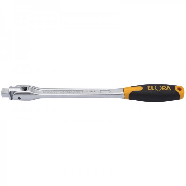 Professional Quality, manufactured from chrome vanadium steel hardened, tempered and chrome plated for corrosion protection. Hinged joint head and positive stops at 0° and 90° Impact resistant plastic hand grip. Length 250mm. Spring-loaded ball bearing for secure socket holding. Sold loose.