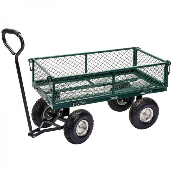 Steel fabricated cart with fold down sides, foam handle and heavy-duty pneumatic wheels. The handle on Stock No. 85634 easily converts for towing, making light work of moving heavy material. A heavy duty waterproof liner is available separately.